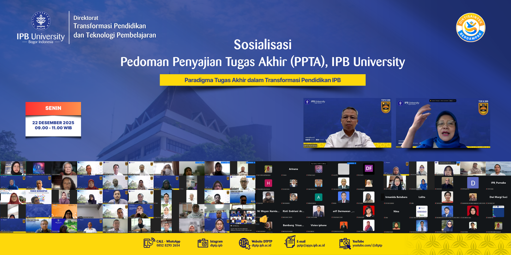 Bogor, 22 Desember 2025 — Direktorat Transformasi Pendidikan dan Pengembangan Pembelajaran (DTPTP) IPB University bersama Tim Ad Hoc menyelenggarakan Sosialisasi Dokumen Pedoman Penyajian Tugas Akhir (PPTA) IPB University secara daring, Senin (22/12).