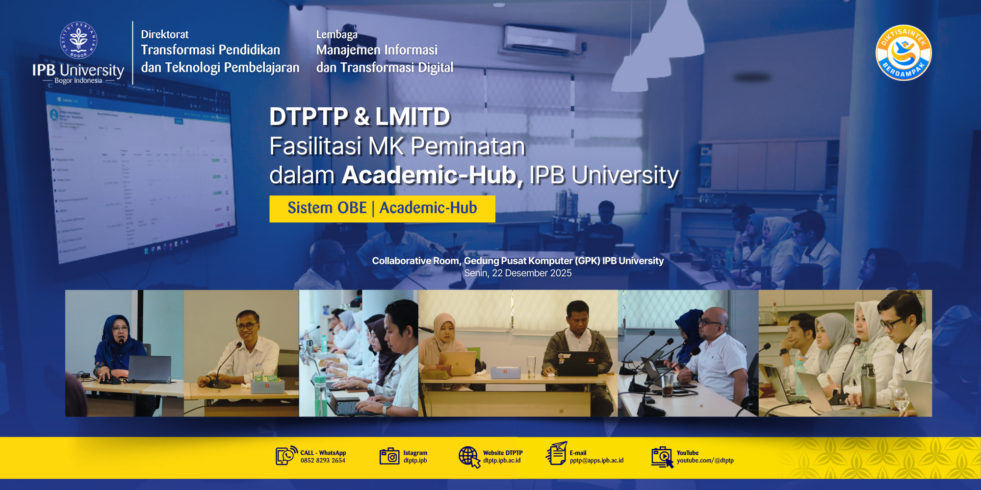 Direktorat Transformasi Pendidikan dan Teknologi Pembelajaran (DTPTP) bersama Lembaga Manajemen Informasi dan Transformasi Digital (LMITD) IPB University menggelar pertemuan koordinatif pada pukul 13.00–14.00 WIB bertempat di Collaborative Room, Gedung Pusat Komputer (GPK) IPB University. Pertemuan ini dihadiri oleh tim DTPTP dan tim LMITD sebagai bagian dari upaya penguatan implementasi kurikulum Outcome-Based Education (OBE) di lingkungan IPB University.