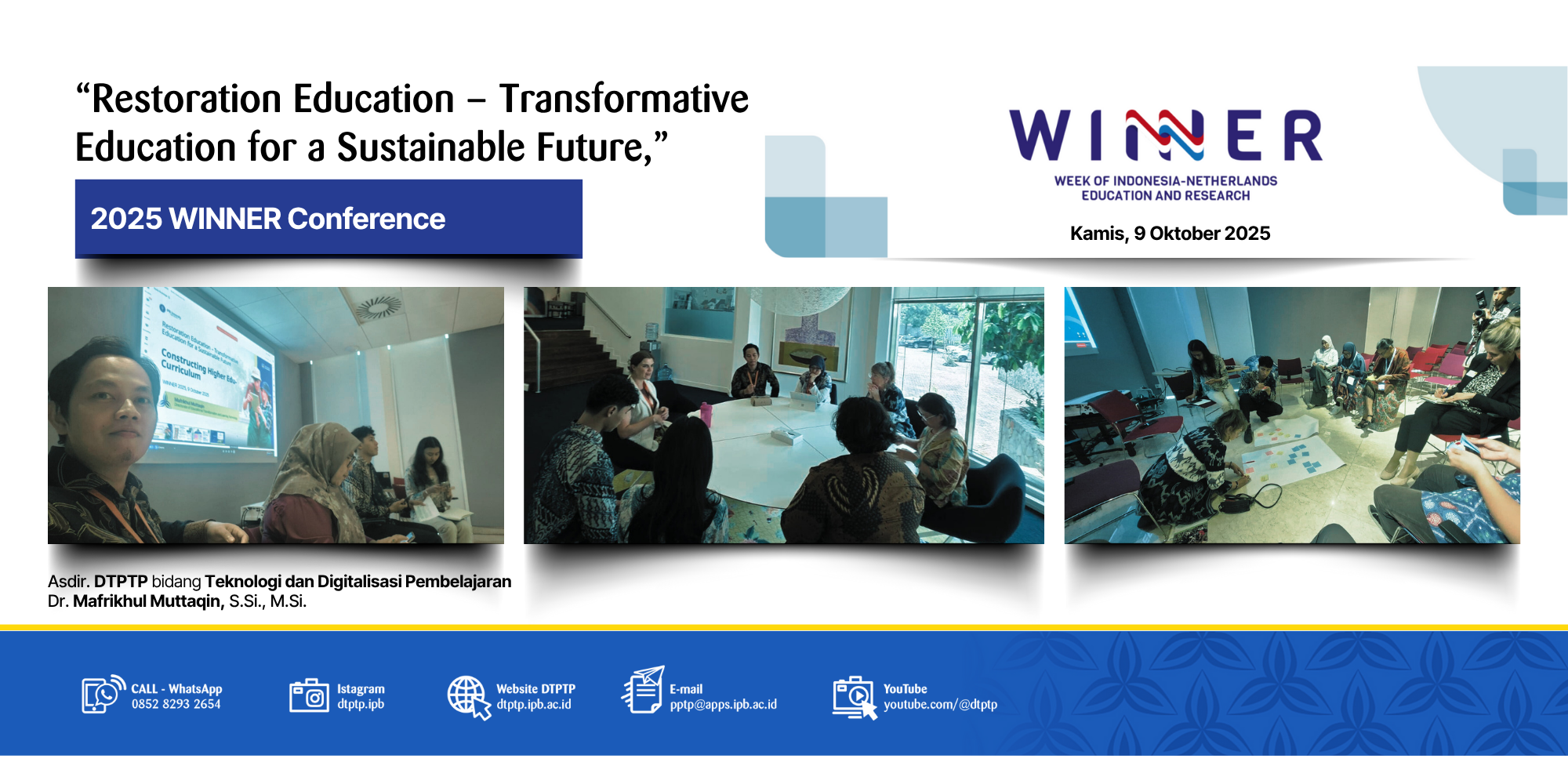 Dr. Mafrikhul Muttaqin, perwakilan dari Direktorat Transformasi Pendidikan dan Teknologi Pembelajaran (DTPTP) IPB University, menjadi salah satu pembicara pada Konferensi WINNER 2025 yang diselenggarakan di Erasmus Huis, Jakarta, pada 9 Oktober 2025. Dalam kesempatan tersebut, beliau menyampaikan sesi bertajuk “Restoration Education – Transformative Education for a Sustainable Future.”