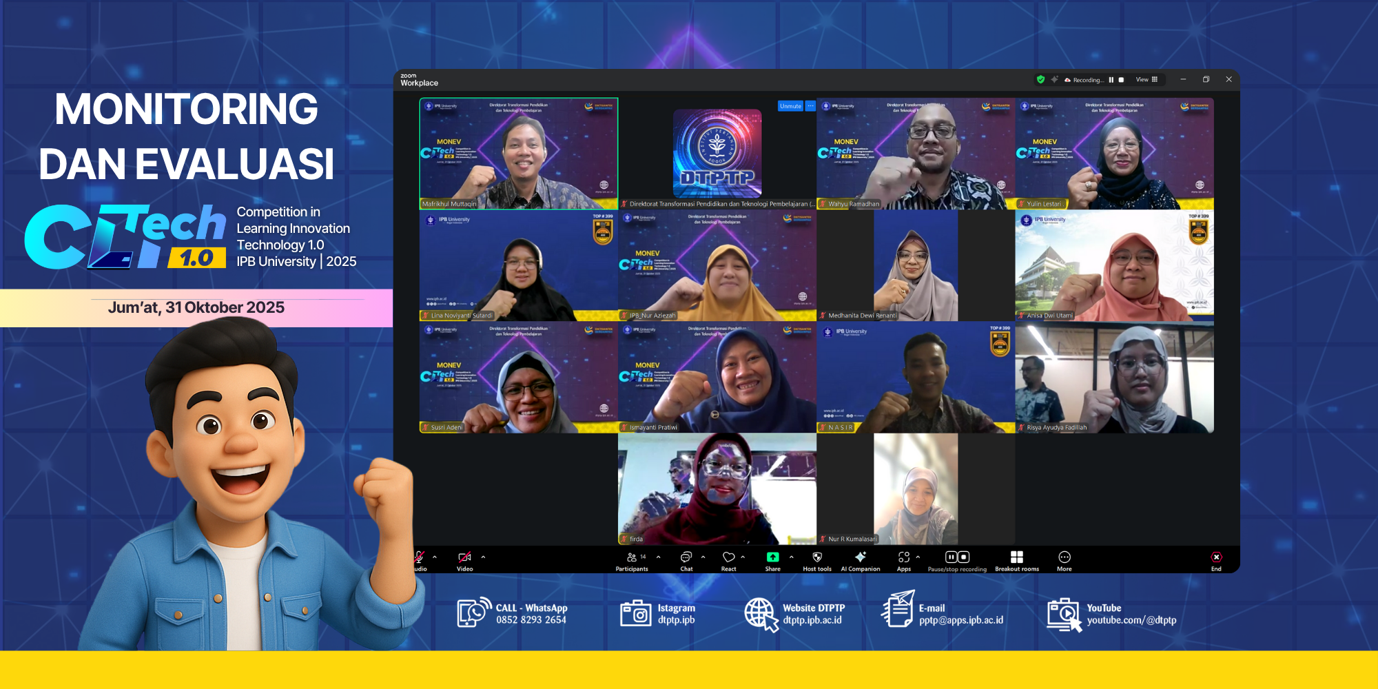 Direktorat Transformasi Pendidikan dan Teknologi Pembelajaran (DTPTP) IPB University menyelenggarakan kegiatan Monitoring dan Evaluasi (Monev) Program Hibah Competition in Learning Innovation Technology (Cli-Tech) 1.0 pada Jumat, 31 Oktober 2025, secara daring melalui platform Zoom Meeting.
