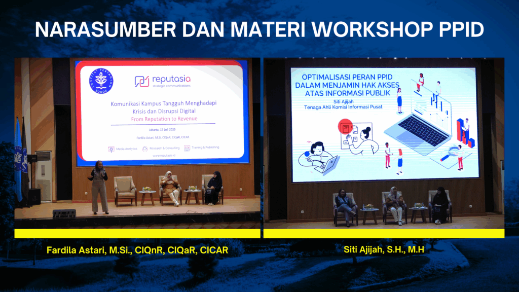Workshop menghadirkan dua narasumber berpengalaman di bidang komunikasi dan keterbukaan informasi publik. Fardila Astari, M.Si., CIQnR, CIQaR, CICAR menyampaikan materi bertajuk “Komunikasi Kampus Tangguh Menghadapi Krisis dan Disrupsi Digital: From Reputation to Revenue”, yang menekankan pentingnya membangun reputasi institusi melalui tata kelola komunikasi yang strategis dan adaptif. Sementara itu, Siti Ajijah, S.H., M.H., Tenaga Ahli Komisi Informasi Pusat, menyampaikan paparan “Optimalisasi Peran PPID dalam Menjamin Hak Akses atas Informasi Publik”, yang menyoroti pentingnya regulasi dan hak publik dalam mengakses informasi yang transparan dan akuntabel.