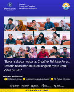 Semangat transformasi tidak mengenal kata terlambat. Melalui Creative Thinking Forum, IPB mempertegas langkah strategis dalam mengorkestrasi VirtuEdu. Ini bukan hanya soal teknologi, tapi tentang menyiapkan ekosistem pembelajaran digital yang konkret untuk masa depan. The future of education is here.